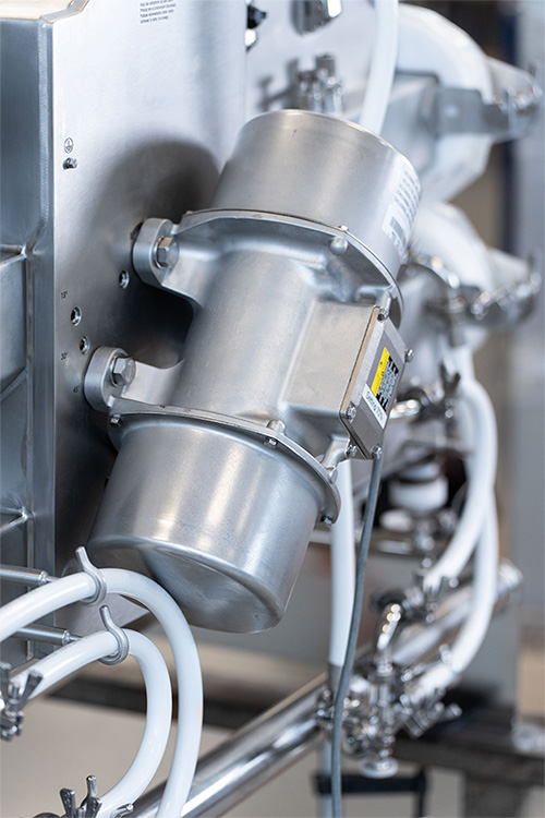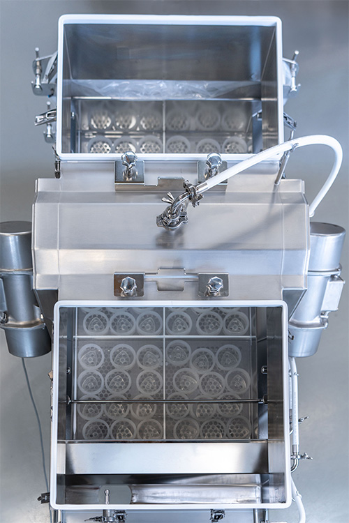 Der intelligente Wechsel des Siebeinlegers ist aber nicht die einzige Komponente, die für das Hygienic Design der Siebmaschine verantwortlich ist. So wurde in einer Anwendung, in der ein pharmazeutischer Wirkstoff gesiebt werden musste, die JEL Konti II CTM komplett in Edelstahl inklusive des Motors und der Federung ausgeführt. Hinzu kamen vergrößerte Radien und eine totraumarme Konstruktion, womit eine schnelle, rückstandsfreie Reinigung möglich ist. Bei der Verschlauchung für die integrierte Reinigung kamen Rundrohre und spezielle Pharmaline-Schläuche zum Einsatz. Statt geschraubten Manschetten wurden Manschetten mit fest verpressten TriClamp-Stutzen in V4A verwendet, damit keine Partikel ein- oder ausdringen können. Außerdem besitzt die Maschine zwei separate Wasserkreisläufe mit jeweils drei Düsen, die demontierbar sind. So können sie bei Bedarf schnell gewechselt werden. Die eigentliche Aufgabe der Düsen war zwar in diesem Anwendungsfall die Benetzung der Wirkstoffe, diese können aber auch zur CIP-Reinigung verwendet werden.